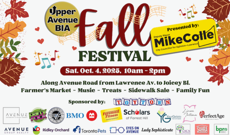 A reminder that the new Upper Avenue Business Improvement Association is hosting a fall festival on October 4th from 10am-2pm. It takes place on Avenue Rd. from Lawrence to Joicey, and there will be something for everyone. Come out and meet your neighbours, discover new local businesses, and hear from Deputy Mayor Mike Colle.